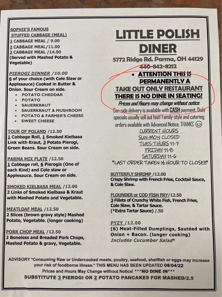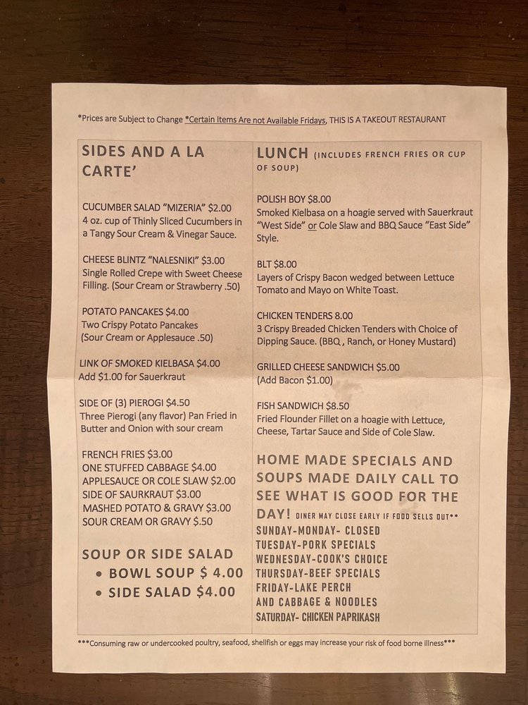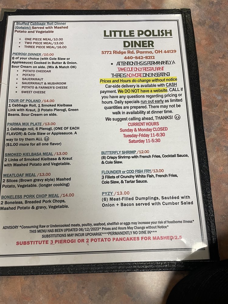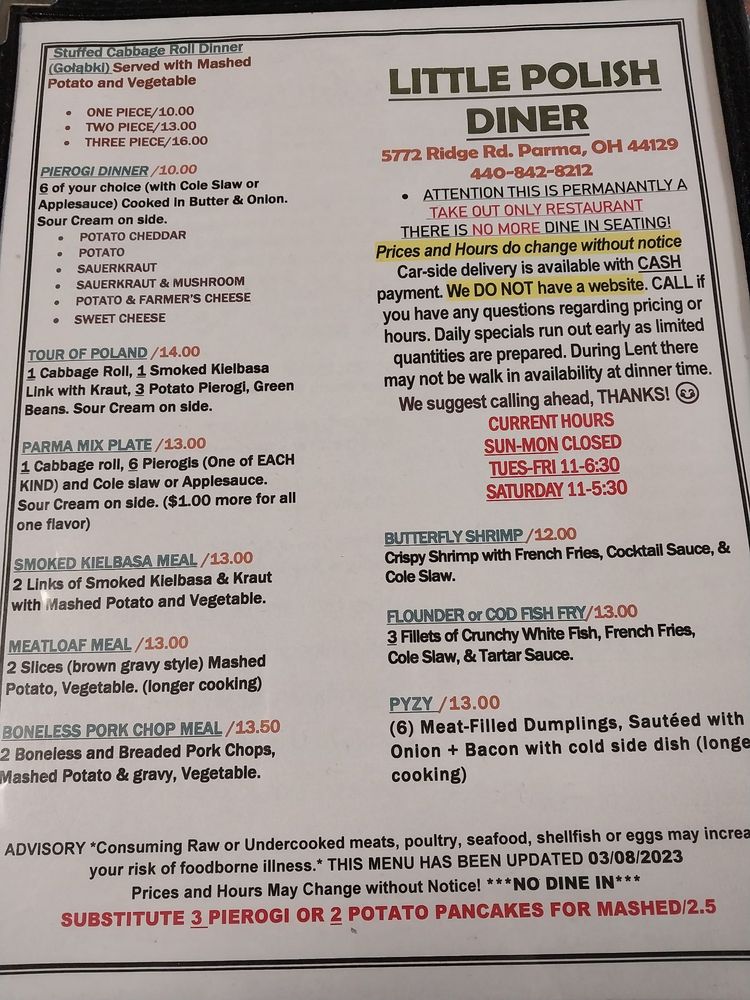 Introducing the menu at Little Polish Diner, a cozy spot in Parma, Ohio, known for its authentic Eastern European cuisine. From stuffed cabbage to meatloaf, the dinner options showcase traditional Polish flavors. The Deluxe Burger and Grilled Ham and Cheese are popular choices for a quick bite, while sides like sauerkraut and cole slaw round out the meal. Customers rave about the pierogies, goulash, and kielbasa, praising the home-cooked taste and generous portions. Reviews highlight the friendly service and focus on takeout, making it a perfect spot to enjoy delicious Polish food on the go. Whether you're a fan of Polish cuisine or looking to try something new, Little Polish Diner promises a satisfying dining experience.